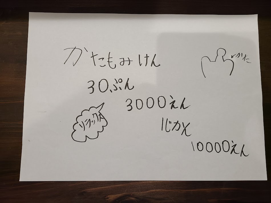 肩こりが気になっているのか、肩もみ券でした。30分3,000円はわかりますが、1時間10,000円は(笑)早速、肩もみ券を使わせてもらいましたが、3分で終了。でも娘に肩もみをしてもらうと時間なんて気にならなく、どんなマッサージ機やどんな上手なセラピストよりも回復力が早いですね。